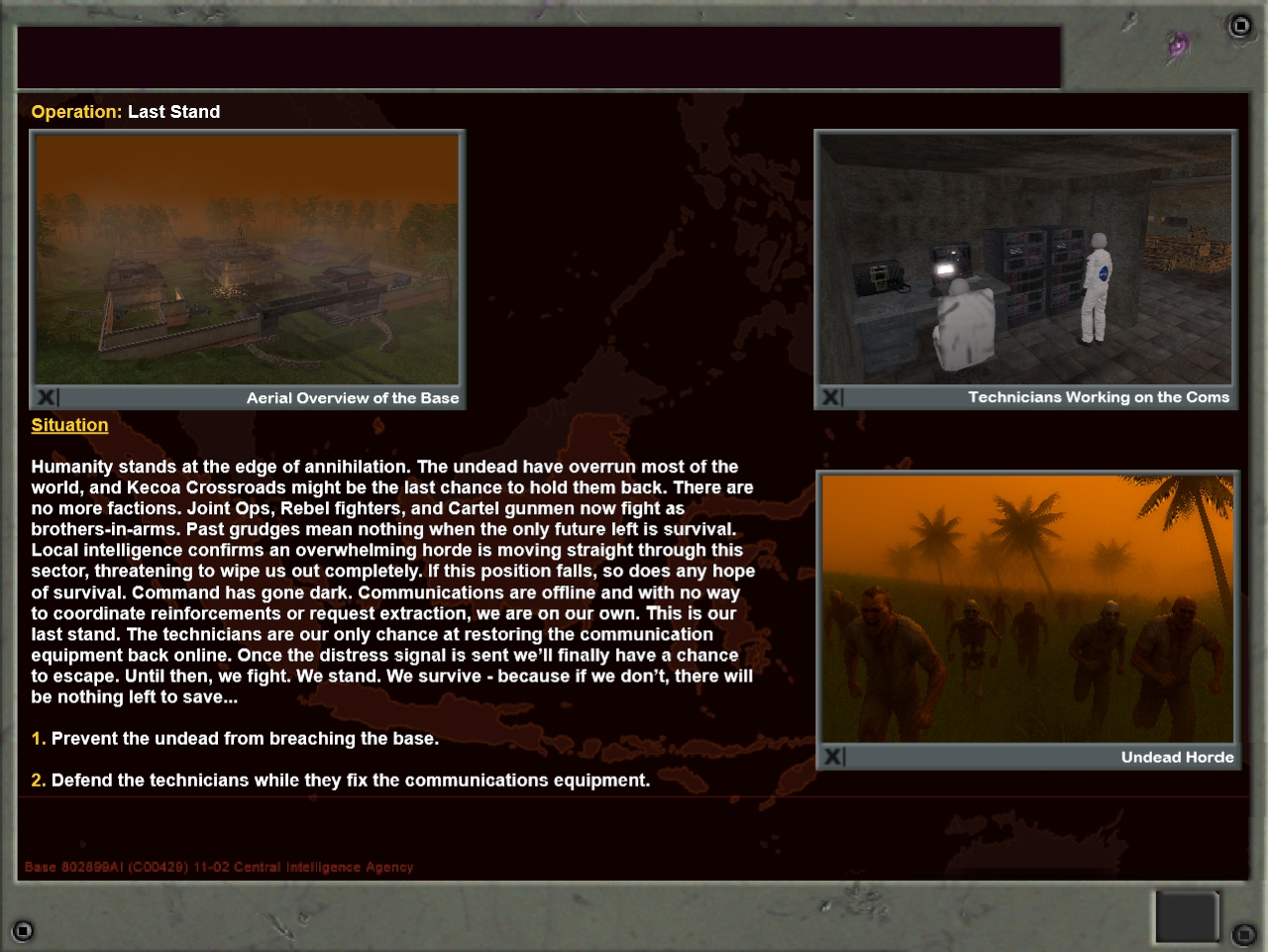 Humanity stands at the edge of annihilation. The undead have overrun most of the world, and Kecoa Crossroads might be the last chance to hold them back. There are no more factions. Joint Ops, Rebel fighters, and Cartel gunmen now fight as brothers-in-arms. Past grudges mean nothing when the only future left is survival. Local intelligence confirms an overwhelming horde is moving straight through this sector, threatening to wipe us out completely. If this position falls, so does any hope of survival. Command has gone dark. Communications are offline and with no way to coordinate reinforcements or request extraction, we are on our own. This is our last stand. The technicians are our only chance at restoring the communication equipment back online. Once the distress signal is sent we’ll finally have a chance to escape. Until then, we fight. We stand. We survive - because if we don’t, there will be nothing left to save...