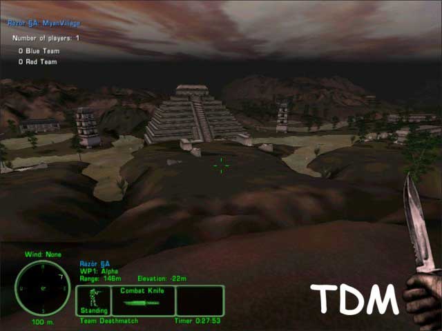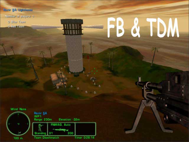 The cash of flags is located in a 2 story adobe building buried in a crater. Both teams start in their own camps equidistant from the cash of flags, and then must run the guantlet to the Red and Blue bases located togehter on a plateau. Land mines, barbed wire, as well as interior ground lights add to the confusion. Respawns above and around the crater will have teamwork at a premium. enjoy!.........STRAIGHT RAZOR.....DF BARRACKS STAFF.