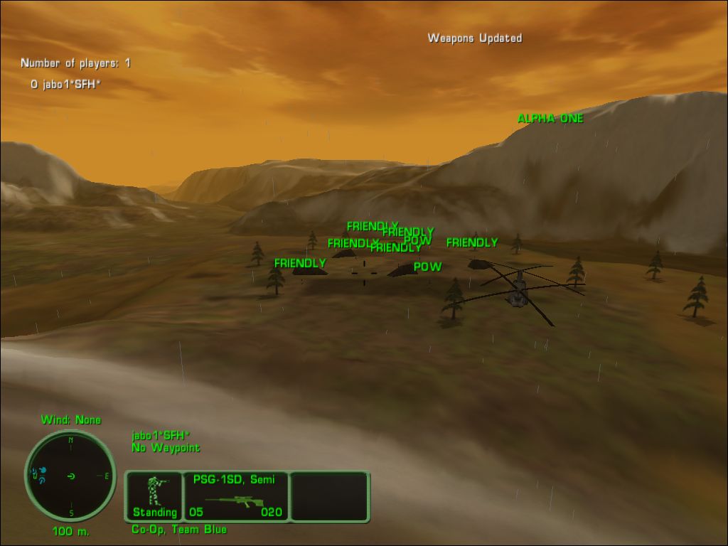 Ranger Team 5 (Sergeant Coach, Corporal Hack, and Corporal Mother), Scout Team 6 near Liberty Base, Golf-3 Black Hawk Air Force, Ranger Team 4 Hummer Transport Team
