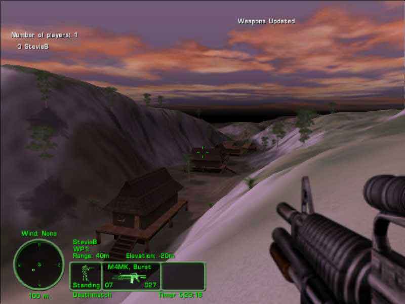 Attacking team has 18 targets to destroy. Attacking team starts in the water about 250m from island that has the targets. A few small ridges provide spots for snipers.