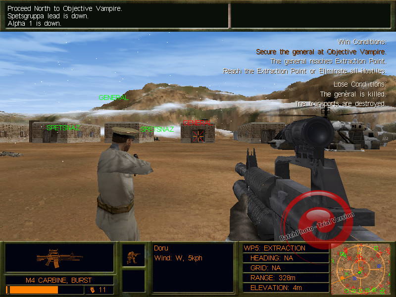 There was some mystakes on the first on the other one, please use this one instead. G.W.B. wants peace with the I.R.R. before he takes his retirement, so you will have to liberate the peaceful General Soumis and bring him back to G.W.B. but it won't be easy!! Good luck and happy dieying!! Goals: 1. Unlock yourself from the "A" base. 2. Destroy 8 white tankers at "B". 3. Find and destrot the nuclear nuke in the "hive" at "C". 4. Bring back the General Soumis to G.W.B. at "A" with the chinook. Hints: Destroy and kill everything destroyable!!