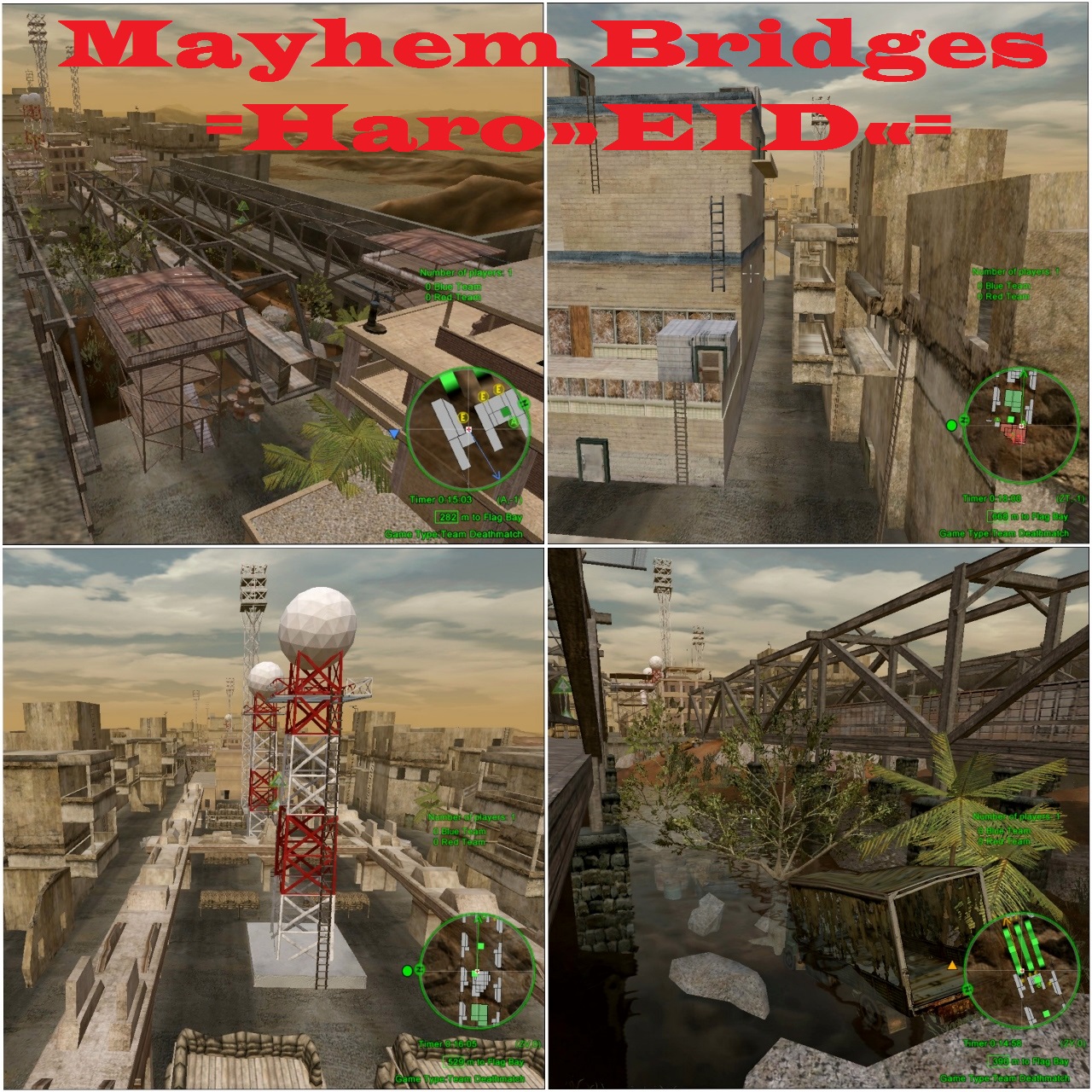 Something new and different from the rest of all my maps, made this map from scratch, it took me lots of time aligning everything cause of the terrain, similar to an old map we use to play long time ago, it's a great enclosed and open map at the same time, there are lots of ways of getting out if you want, for sniping or to surprise your enemy at his home base, control the mayhem bridges and the rest will be easier, nice medium map for all kinds of action and surprises, get all spawns and the action will intensify dramatically, I'm sure you'll enjoy it.