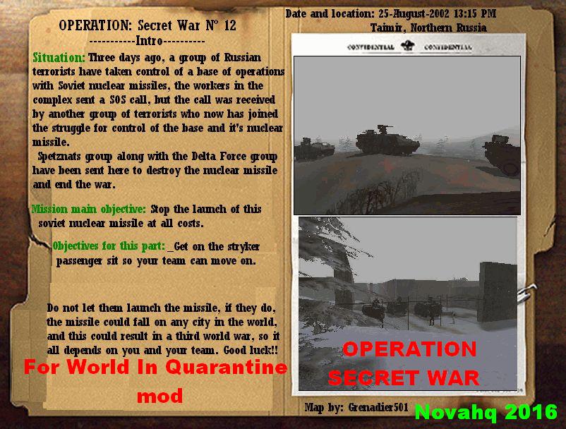 CENTCOM, has learned that Soviet ex-Speznaz and Terrorist operatives have gained control over a Russian ICBM launch site and are using stolen launch codes to attempt to launch 2 ICBM missiles from the ICBM SILOs. If these Soviet ex-Speznaz and Terrorist operatives are successfull in launching the ICBMs, they will start a full NUCLEAR reaction from all NATO Countries within this AREA! MILLIONS may die if the Missiles are launched! IT IS UP TO YOU TO STOP THEM !