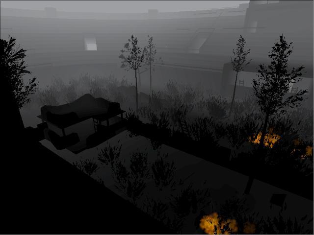A CQB map 75m distance grey fog, a crashed blackhawk with zone, two flame towers for snipers, note u can just about see the blackhawk helicopter, 2 armorys, bushes and trees and some crocodiles