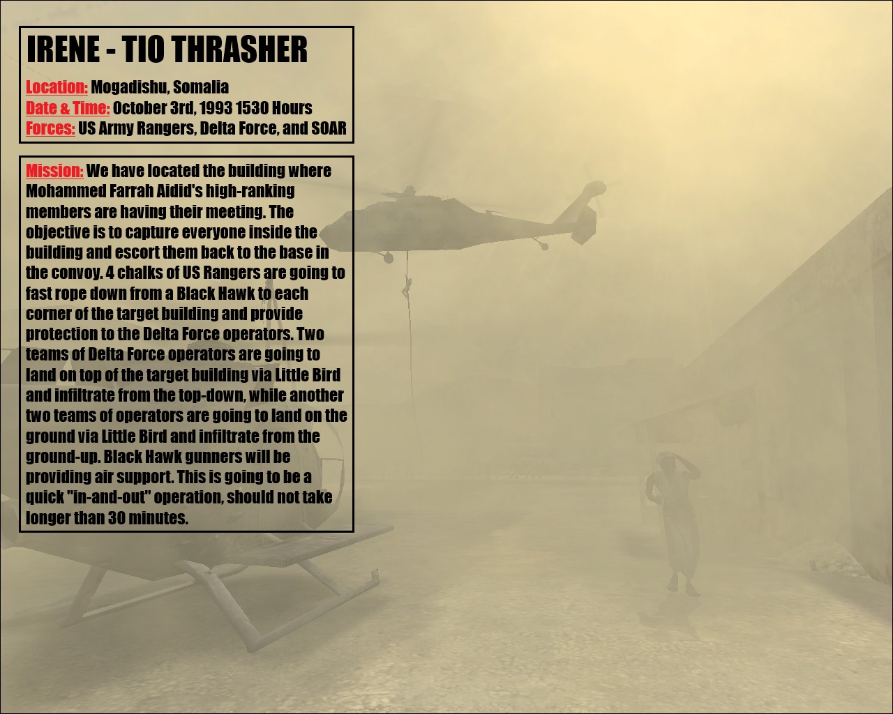 Mission: We have located the building where Mohammed Farrah Aidid's high-ranking members are having their meeting. The objective is to capture everyone inside the building and escort them back to the base in the convoy. 4 chalks of US Rangers are going to fast rope down from a Black Hawk to each corner of the target building and provide protection to the Delta Force operators. Two teams of Delta Force operators are going to land on top of the target building via Little Bird and infiltrate from the top-down, while another two teams of operators are going to land on the ground via Little Bird and infiltrate from the ground-up. Black Hawk gunners will be providing air support. This is going to be a quick "in-and-out" operation, should not take longer than 30 minutes.