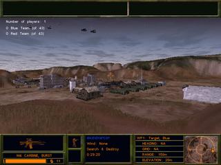 A CQB map. 2 big hangars facing each other ..... in each hangar theres an armory, tanks and bunkers with fixed gun-emplacements. 6 targets per team. Excellent for squad CQB and endurance training. Theres not much cover between bases and theres no way out. [Not a map for snipers.]
