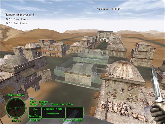 Nice mid-day, simple map, but for fast action. No armories are present. Bunch of wooden western style buildings, surrounded by small hills. Designed for CQB but some sniping is possible.