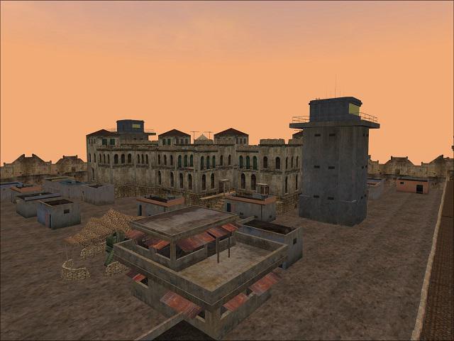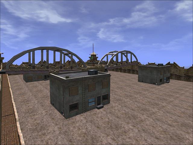 A small arena with two large buildings in the center. There are many ways to the top so look out!