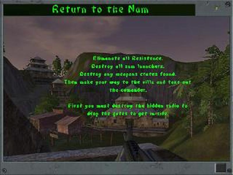 Your mission is to make your way to the main HQ and call in Black Widow but first you must take out all resistence you may encounter. Destroy all weapons crates and find the black boxes that was on -board the lil birds beefore they where shot down. Find them before the VC does they contain important information that does not need released. Good Luck!!