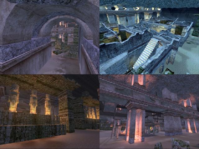 Ancient ruins were buried centuries ago by a massive volcanic eruption. In this large cavern there are places to climb and hide and 1 PSP. The map was designed for 32 players. The screen shot has the fog removed to show detail. Fog in game is set to 100m