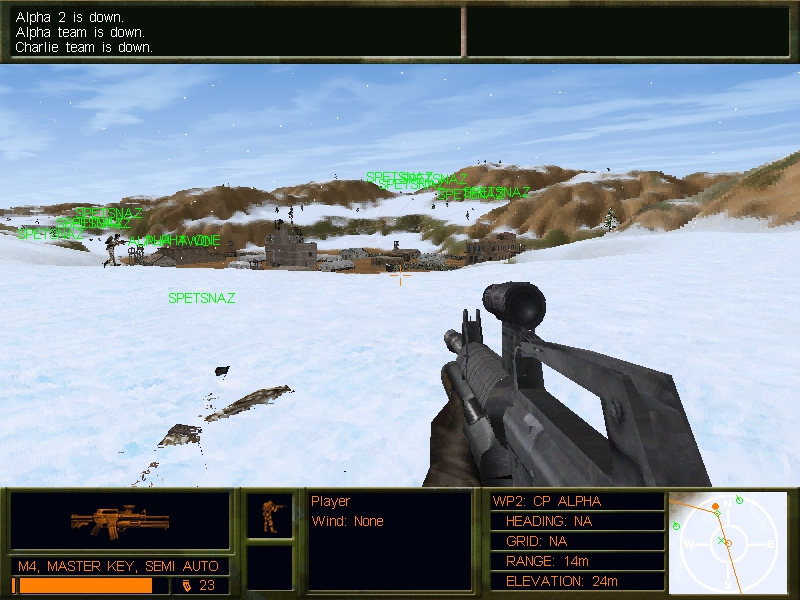 SINGLE PLAYER ONLY! Mission: A russian base in Moscow has been found...only problem is, it is stocking two active Mig 29's, that violates the recent made U.S. and Soviet peace conctract. Move in with Alpha 1 and 2, but dont expect them to be alive for long... Destroy the 2 Mig 29's, then head to a blackhawk waiting in the distance (visible at begging of mission), where an allied russian spetznaz team is giving cover for the chopper. Snipers in gaurd towers, and intermediate enemys in this mission.